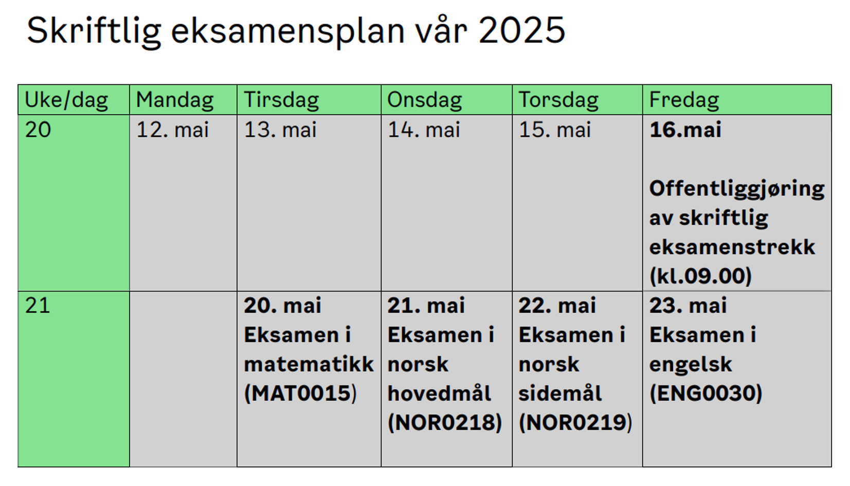 - Skriftlig eksamen i norsk og engelsk har forberedelsesdel. Informasjon om dette finner du i eksamensplanen.
